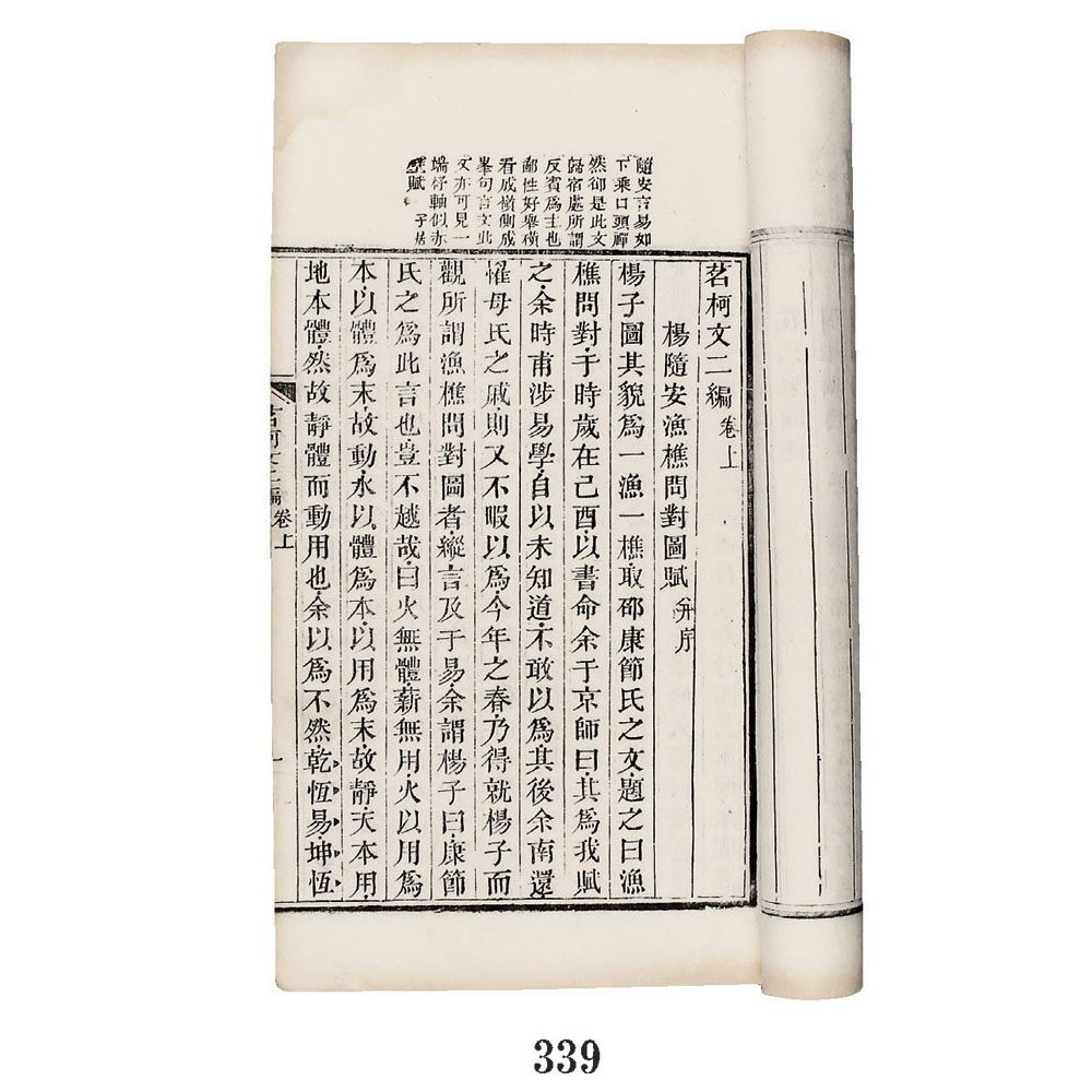 拍品为白纸印本,天头敞阔,行格整饬,字形斩方。全书共四编,前有曾国藩、阮元序。张惠言(1761-1802),清代词人,散文家,原名一鸣,字皋文,武进人,嘉庆四年进士,充实录馆编修。为常州词派的开创者。