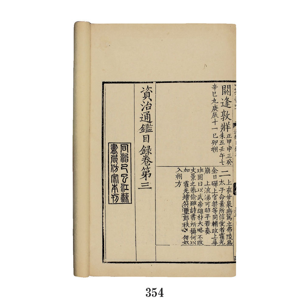 提 要: 是书大开本,线装为十厚册,天头敞阔,版面清爽。此书又名《通鉴目录》,是《资治通鉴》的提要,仿《史记》年表的体例,纪年于上,列《通鉴》卷数于下,可视为《资治通鉴》索引。江苏书局,又名苏州书局,是清代江苏的官方书局。同治七年江苏巡抚丁日昌奏设于苏州沧浪亭。以翻宋本《通鉴目录》和翻刻胡克家本《资治通鉴》为佳,由莫友芝主持其事。