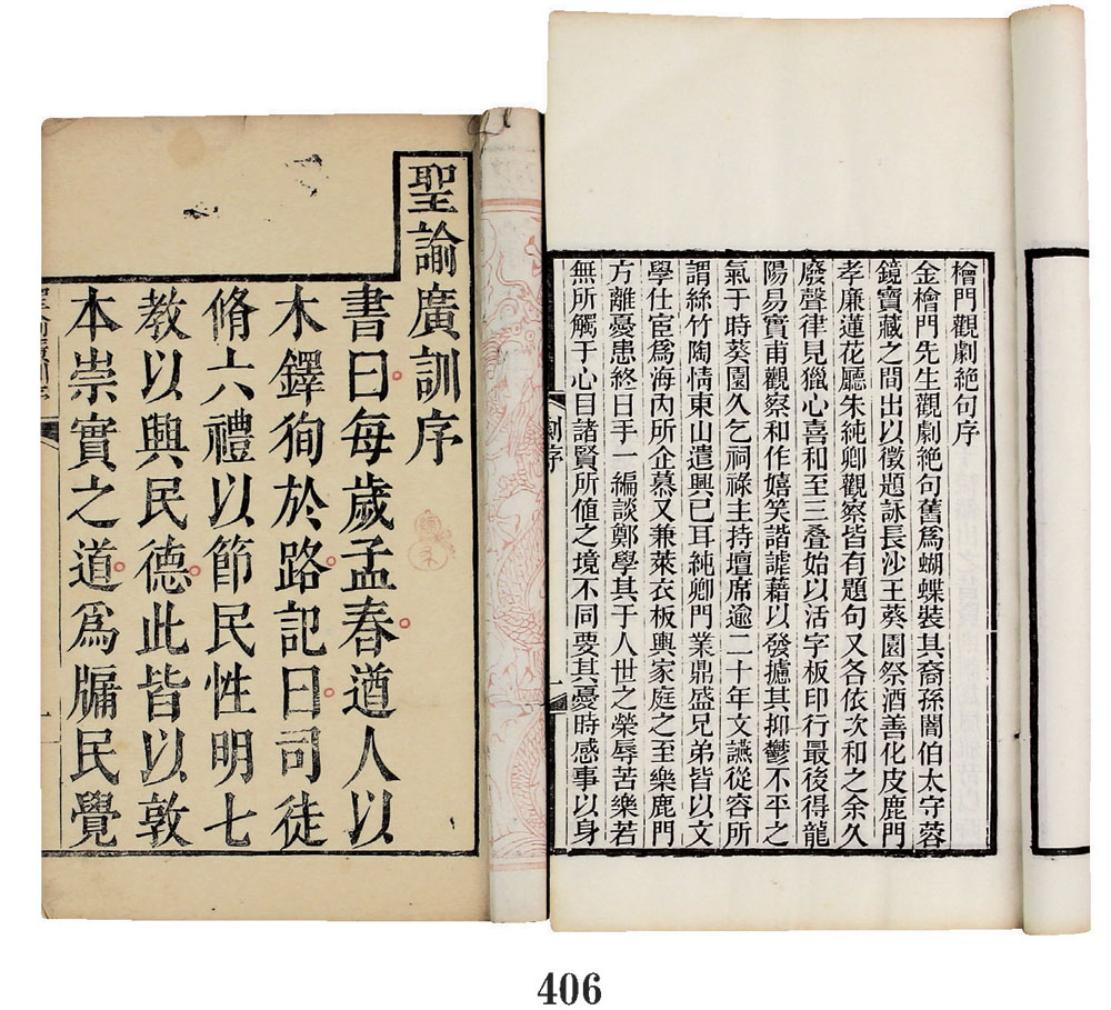 拍品包括《桧门观剧绝句》与《圣谕广训》二种。其中前者为白纸印本,装为两册,是乾隆时状元金德瑛所撰的观戏题诗,由叶德辉刊刻完成,颇具文献价值。
