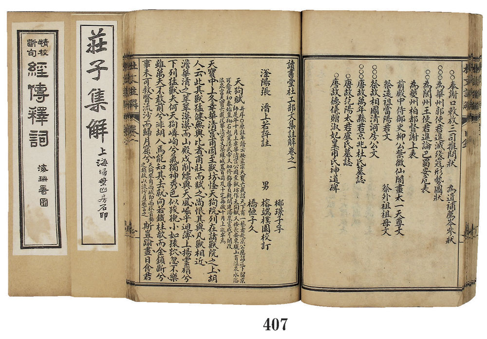 拍品包括石印本《庄子集解》与《经传释词》两种,皆一函四册,白纸印本,另有《杜诗镜铨》一种。皆品相上佳。