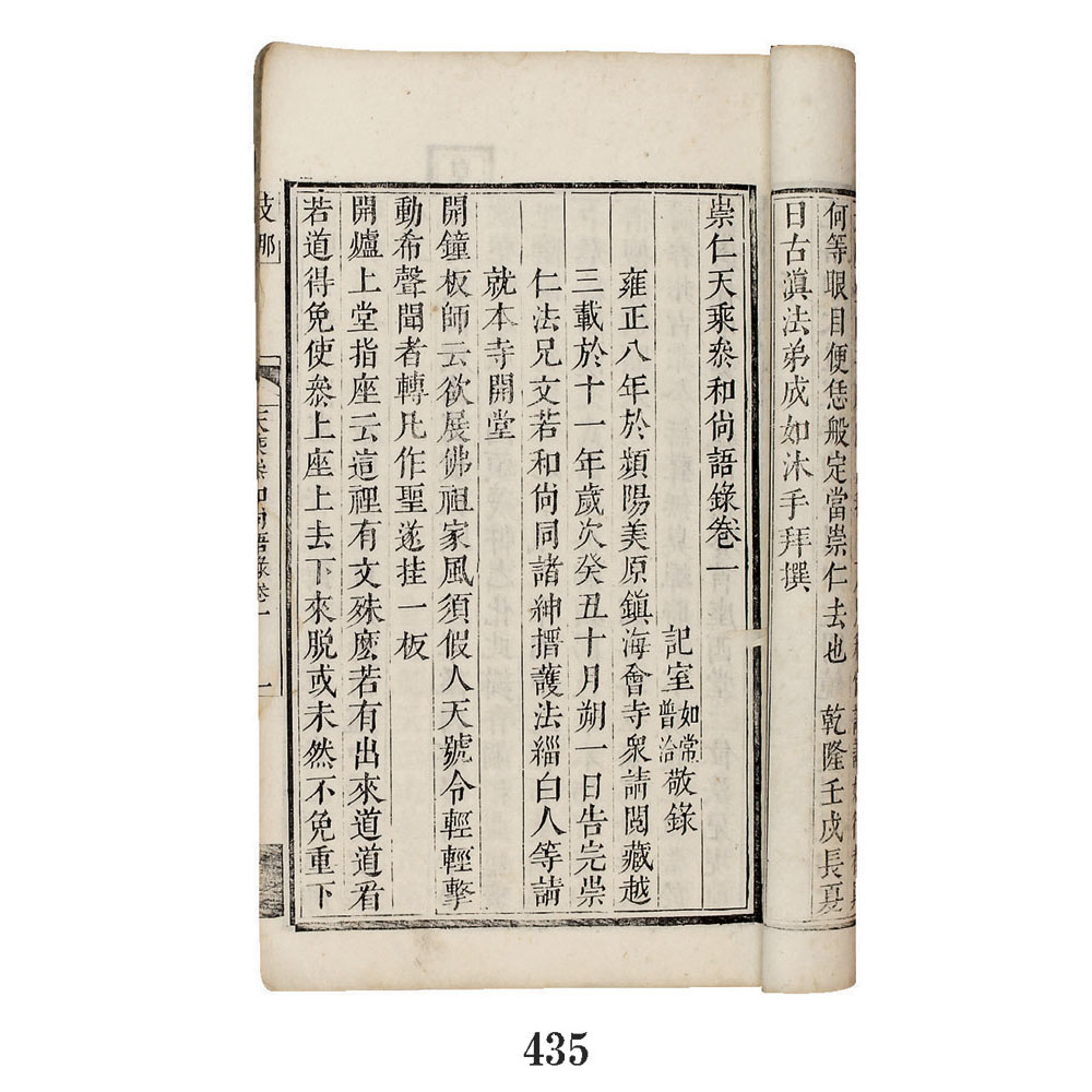 拍品包括日本刻《崇仁天乘参和尚语录》一册,存一到二卷;清刻《感引篇引经笺注》。二书皆是白纸印本,印制水平上佳。
