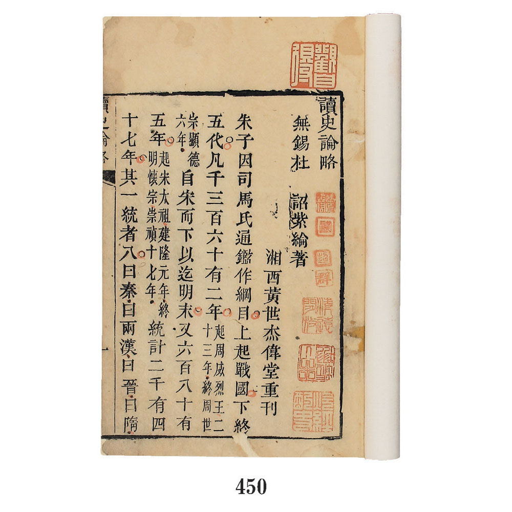 是书竹纸精印,墨色浓郁,较初印,第一册通篇红笔圈点。该书所论历朝治乱兴亡事迹,上起战国,下迄明末,共计2047年。评论历代帝王和将相大臣,褒贬忠义节气之士和外戚宦官。