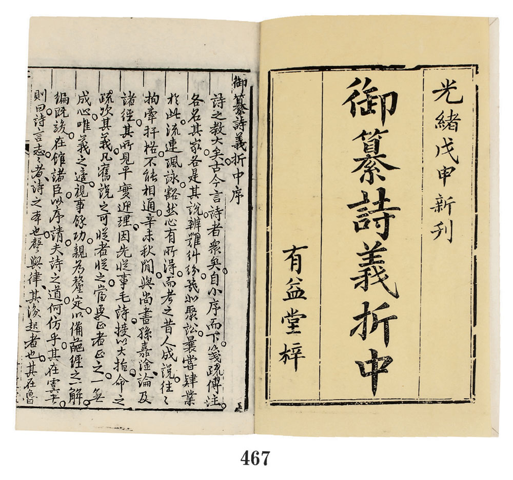 拍品包括:《御纂诗义折中》二十卷,清光绪三十四年(1908)有益堂刻本,一函六册,刻印俱精,品相佳;《书经体注大全合纂》六卷,清光绪二十年(1894)澹雅书局刻本,四册,拍品为全帙,书前附图若干;《左传句解》六卷,清光绪四年(1878)有益堂刻本,三册;《书经增订旁训》,清刻本,二册。