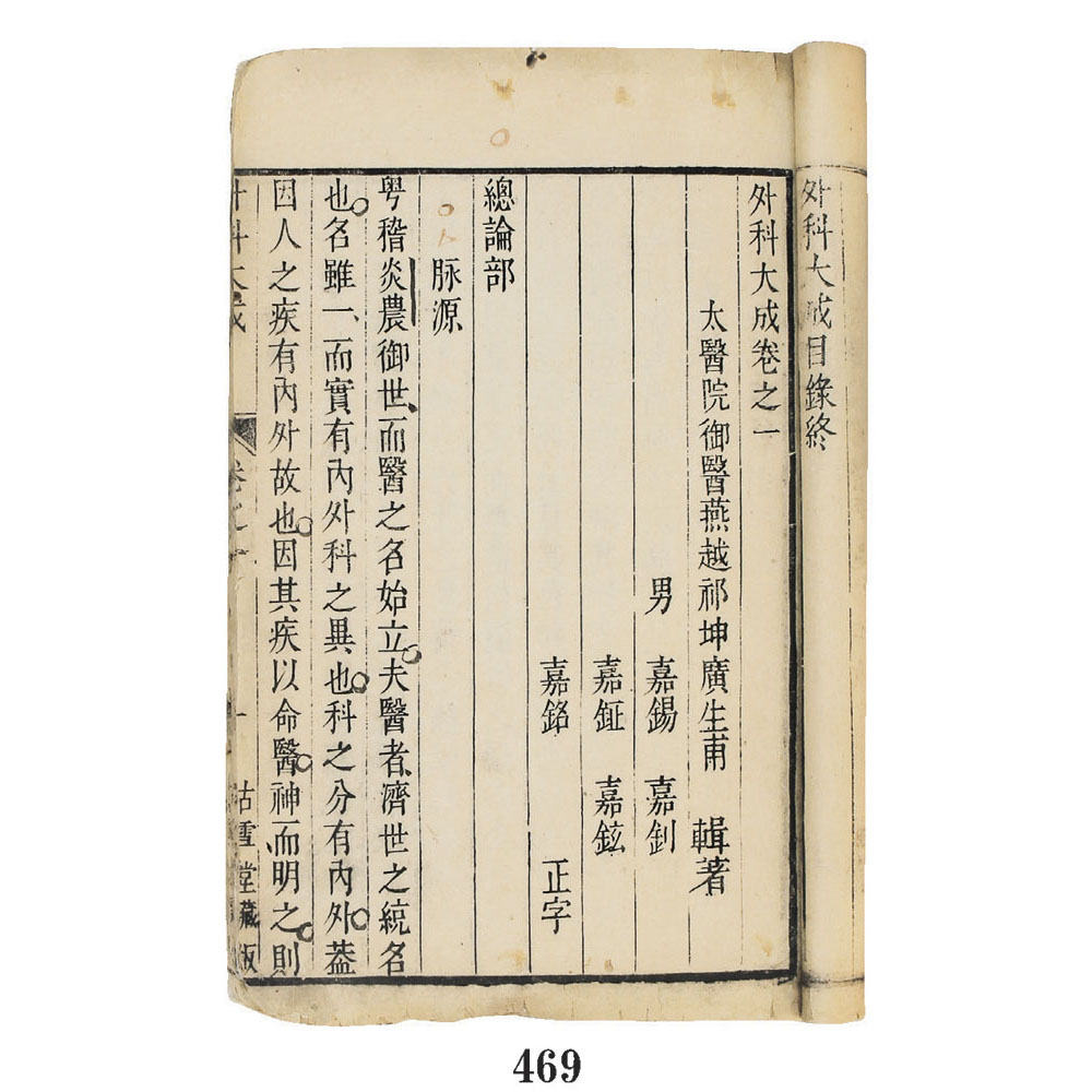 是书字体细长,行格疏朗,整饬如一。版心下方镌有“古雪堂藏板”,卷前有大体字序文,清晰醒目。该书为外科著作,在外科辩证和治法方面较详细,章法严谨而规范。清代官修的《医宗金鉴外科心法要诀》即以此书为蓝本。祁坤(1610-1690),字广生,绍兴人,顺康间御医。