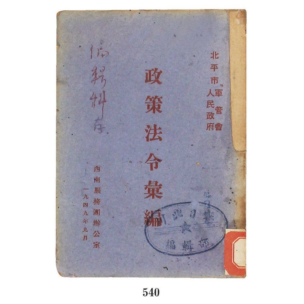 拍品皆为32开本,分别为北京市、天津市、南京市三市军管会人民政府颁布的各种政策、法令各一册,对研究建国初期的历史具有重大参考价值。其中北平市政策法令汇编另有一本。