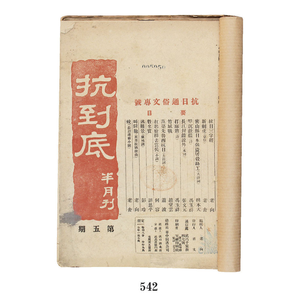 拍品16开,内收《抗到底》第五期,及第十六期至第十八期,合订为一册。此为半月刊,内收老舍、冯玉祥等人撰抗日宣传类文章,通俗易懂,极易唤起民众的抗日激情。另有不知名期刊一期,16开64页。