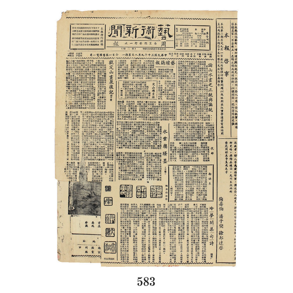 拍品含《艺术新闻》创刊号、第二期两张,该报纸由陶寿伯任总编,丁悚、徐卓呆等人任编辑。丁福保、吴湖帆、王个簃等名家为此刊特约撰稿人。
