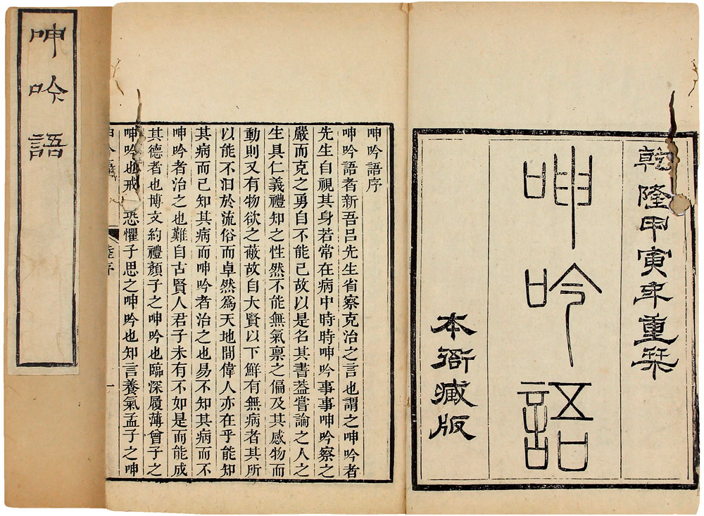 提 要: 此书老装旧函,未加衬纸,装为六册,品相上佳。全书字体整饰,镌刻甚精,该本为吕坤后人吕燕昭任江宁知府时,请当时南京名工顾青崖刊刻的,黄裳在《清代版刻一隅》中曾云:“乾嘉以还,在金陵、苏州、杭州出现了不少著名的刻工,如金陵的顾青崖、穆大展,苏州的许翰屏…”能与这些名工齐名,可见其影响。