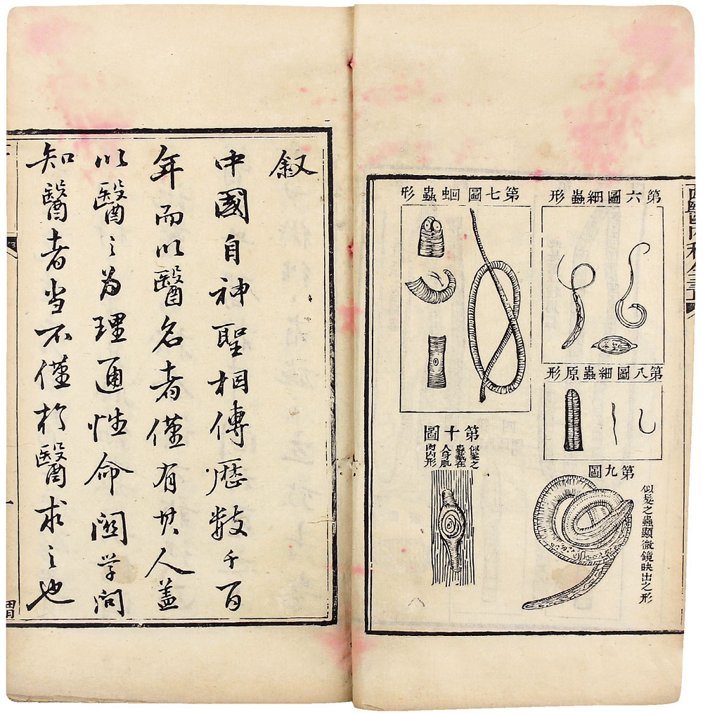 是书方字镌刻精整,附图十余幅,装为六厚册。卷前有光绪间潘骏献、李定源、孔庆高序,写刻上板。此为西医学传入我国的第一部专著。