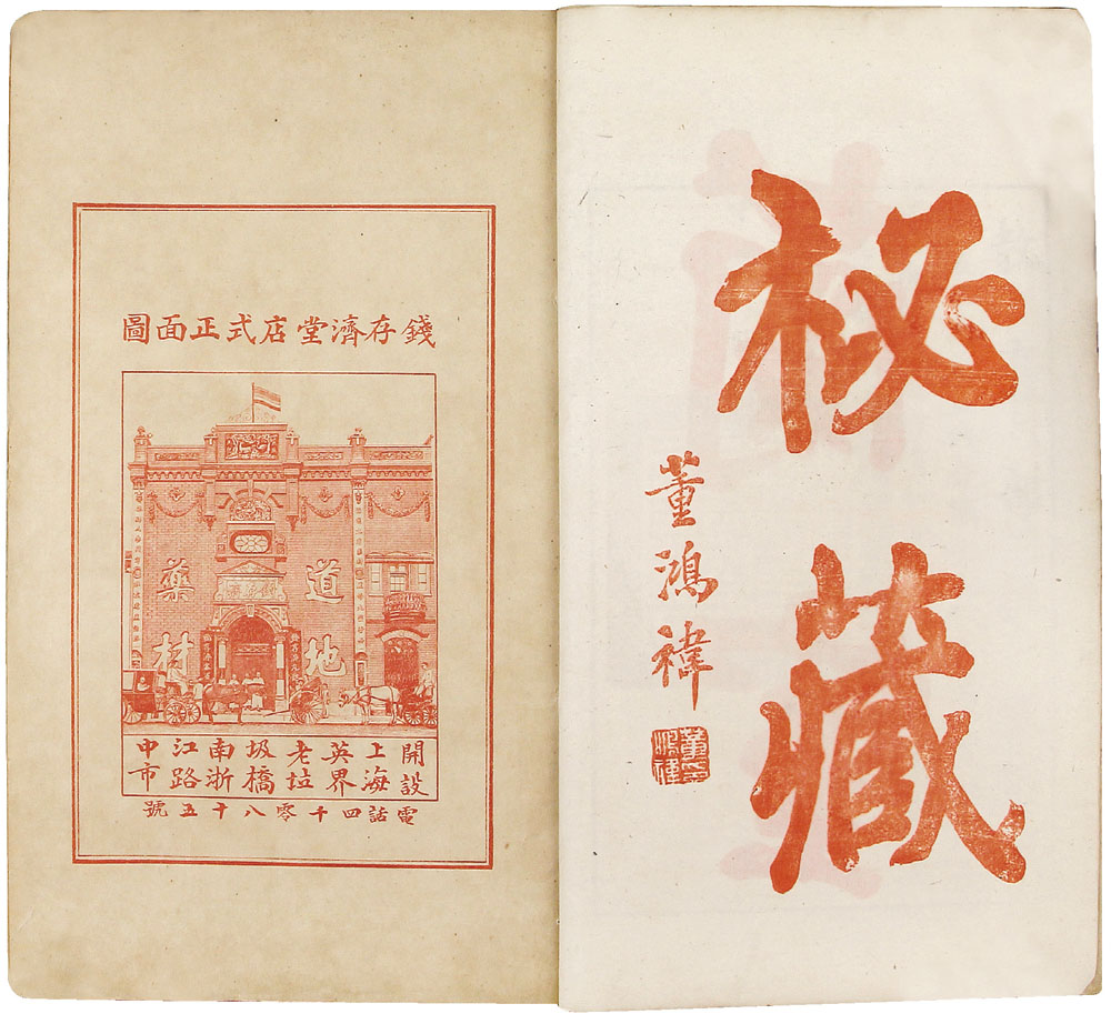 是书为白纸印本,字体写刻,卷前二十余页序文皆为红印,版心下镌“钱存济堂”,附插图。民国元年,钱文缙经国民政府内务部与教育部批准,在上海开设钱存济堂大药房,颇具影响力。