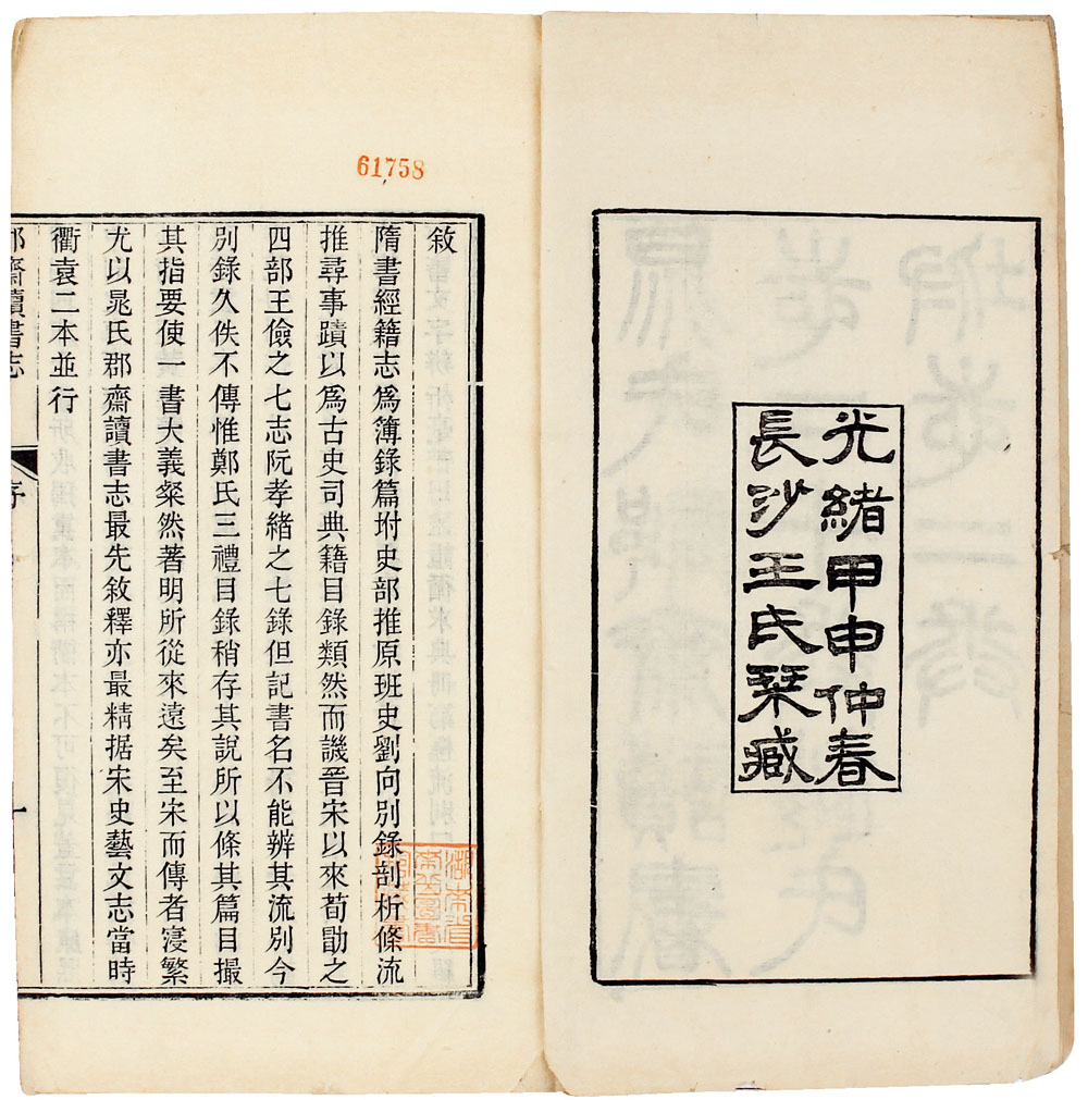 提 要: 是书竹纸未衬,天头敞阔,行格疏朗,字形整饬,刻印俱精,点划甚为清晰,为初印之本。《郡斋读书志》是我国现存最早的、具有提要内容的私藏书目,对于后世目录学影响极大。传本有宋理宗淳佑九年刻于衢州的“衢本”与淳佑十年刻于袁州的“袁本”两种版本系统。光绪间王先谦以汪士钟重刻衢本为底本,校以陈师曾重刻袁本之抄本等,成一合校本,是为此书。