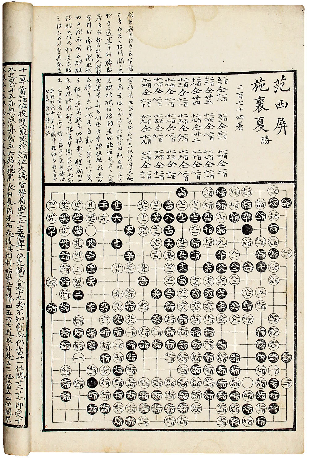 提 要: 是书开本阔大,白纸印制,牌记页题“新安程兰如先生评”、“似园汪氏校刊”。内有落款曰“晋卿赵钧”者跋文一篇。赵钧者,不知何人也,但观其跋文,或为棋手。此书为围棋书谱,清时期国手施襄夏、程兰如合评。卷首有毛孝光作《序》。全书选刊徐星友、梁魏今、程兰如、施襄夏、范西屏等著名棋手的二十二局对子棋谱,每局都有详细的评论。