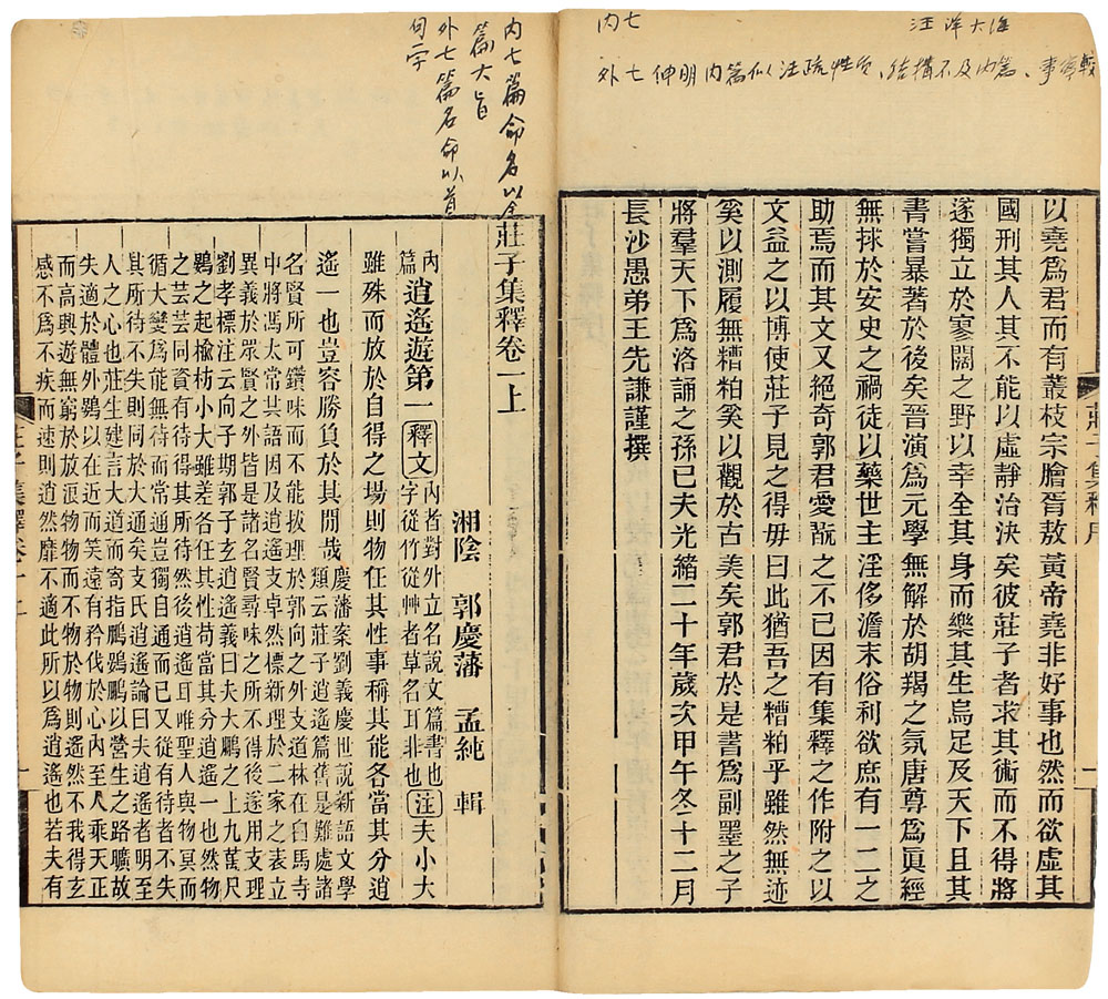 提 要: 拍品内有前人通篇墨笔批校,细审之下,颇见功力。是书为清代关于《庄子》的注疏、训诂的集大成之作。其主要成就在于:精密校订《庄子》本文,既能辨析古本异文正误,也揭示了某些前人未知的讹误;精心辑录散佚旧注,对陆德明《庄子音义》所录司马彪注多有补充;精确考释字词名物,在辨识通假字、训释疑难字及古代名物方面都有创见。再细审批语,对书中的疏漏、讹误又多所补益,大大增加了本书的学术价值。 郭庆藩(1844-1896),字孟纯,号子静,湘阴县城人,官浙江知府。有《十二梅花书屋诗集》、《庄子集释》等。