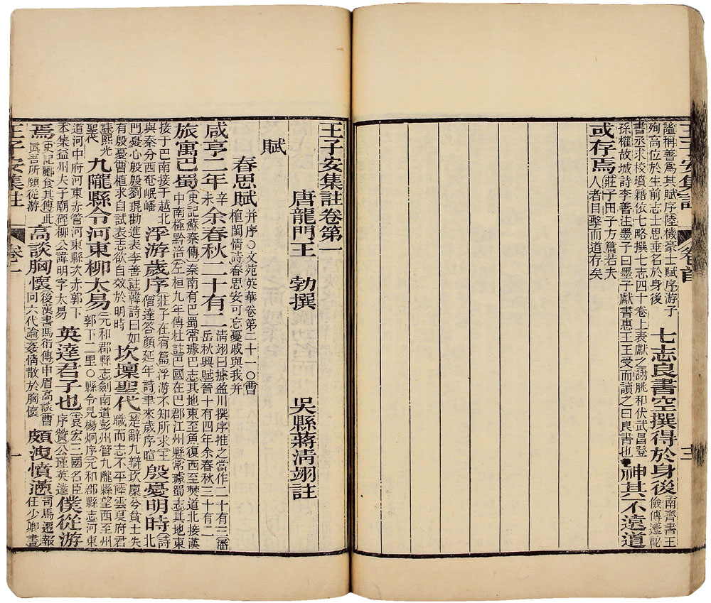 是書刻印頗精,墨清字明,品相上乘。王勃字子安,山西河津人,初唐大詩人,“初唐四傑”之首。該書為吳縣學人蔣清翊自注自刻本,也是同光以前最好的王集版本。
