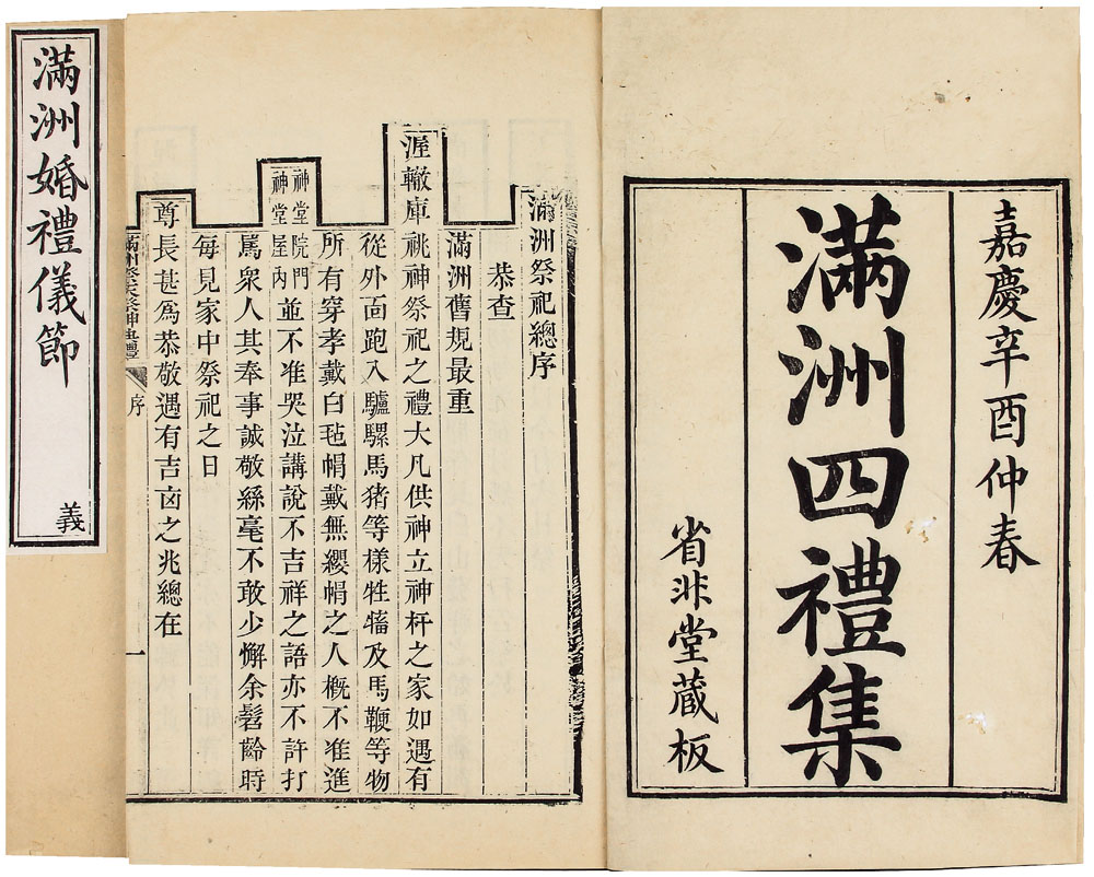 《满洲四礼集》系《满洲祭天祭神典礼》、《满洲婚礼仪节》、《满洲慎终集》、《满洲丧葬追远论》、《满洲家祠祭祀仪注》五部合刻之书的总称,其书衣题签用“仁”、“义”、“礼”、“智”、“信”五字表示其相应的顺序,是一部介绍满洲祭天祭神、婚礼、慎终丧葬、家祠祭祀等的书。