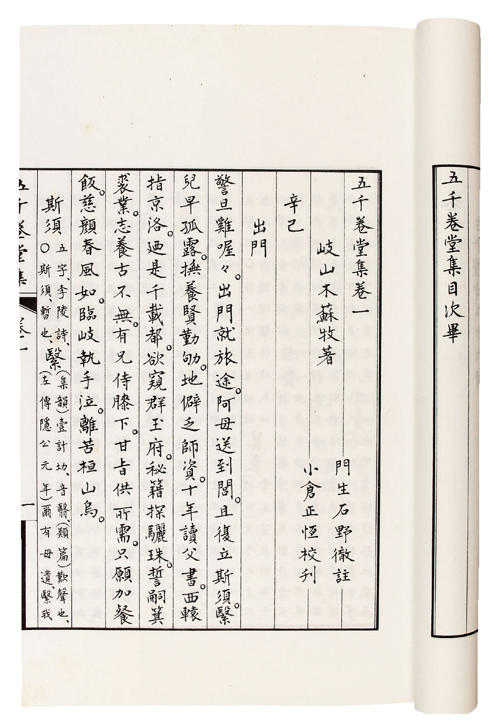 是书为白纸精印,纸白墨浓,字体秀美。每卷卷一下题“岐山木苏牧著,门生石野辙注,小仓正恒校刊”。卷末有“寺西秀武作字”一行。次跋一篇。最末有昭和十年刊印牌记。