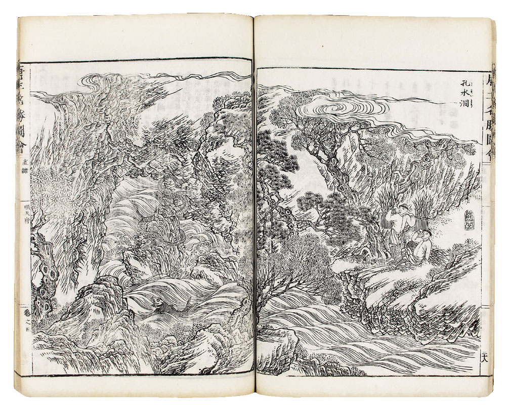 是书镌刻于日本文化二年,即中国清嘉庆十年,是中日文化交流的珍贵图籍。所谓“名胜图会”是指流行于日本江户时代的对名胜古迹的介绍本的形式,以图画来表现其来历、地点等。其中的大量插图版画构图丰满,线条细腻,人物形象细致入微。拍品存卷二、卷五。