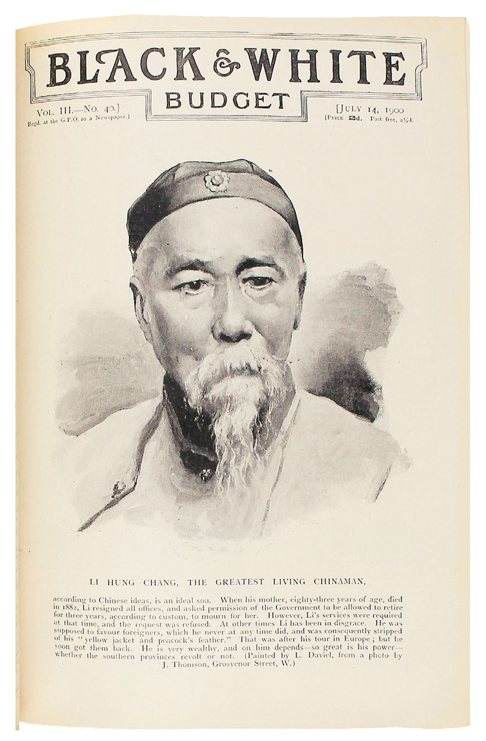 提 要: Black and White Budget是英国维多利亚时期发行的画报周刊,杂志因收录大量黑白照片、地图、图纸等而得名。最初名曰Black and White,于1899年10月14日发行,后为Black and White Budget,后又更名为Black & White Illustrated Budget,1905年6月17日终刊。拍品为1900年4月7日至1900年9月29日、1900年10月6日至1901年3月23日合订本,精装二册,16开。其中1900年7月14日发行的第40期封面人
