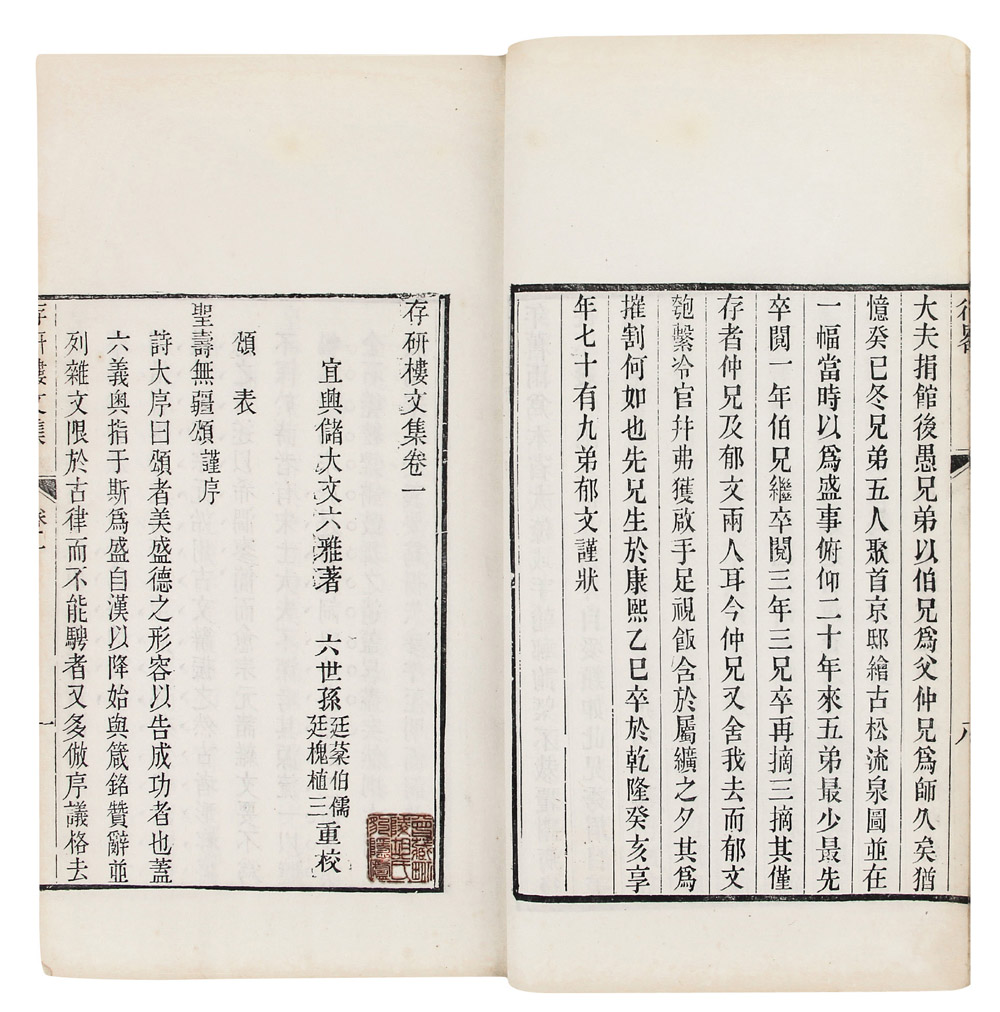 是书为白纸印本,开本阔朗,品相佳,流传少。此为储大文文集,大文(1665-1743),字六雅,号画山,别号樊桐逸士,宜兴人,康熙六十年进士,官翰林院编修,后主扬州安定书院讲席。