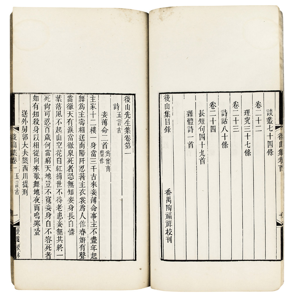 提 要: 是书为白纸初印本,天头极为敞阔,刻印精工,纸墨明湛。雍正王原序后镌“广州龙藏街萃文堂承刊”,目录后与每卷之末均镌“番禺陶福祥校刊”,版心下镌“爱庐校本”。清代广州的刻书铺多在西湖街、龙藏街一带,萃文堂即是其中一个著名刻书坊。 傅增湘先生云:“近时《后山集》传世者,以光绪乙酉番禺陶福祥刊本最为通行”,即指此本而言。