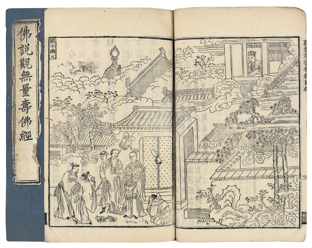 提 要: 是书老装未衬,原签亦存,开本敞阔,白纸初印,字体方正,有明末毛氏汲古阁刻书遗风。前有“顺治乙未(1655)秋日南湖老人翁行盛撰序”,“乙未(1655)秋日武林菩萨戒弟子张文嘉序”。全书共有版画六十八幅,一页一图,刻印极精,人物线条流畅,佛像开脸慈眉善目,庄严肃穆,惟妙惟肖。拍品可谓清代版画之白眉,藏家当珍之宝之。