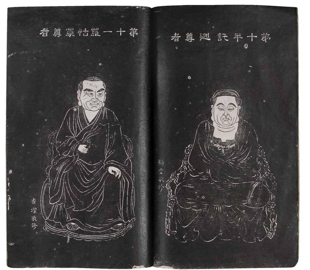 是书老装,原签存,内收十八罗汉像拓片,拓工精湛,泐口清晰。罗汉像形态各异,其线条流畅,特别是眉毛、胡须、衣服的褶皱的线条极其精细,形象呼之欲出,有一定的艺术欣赏价值。