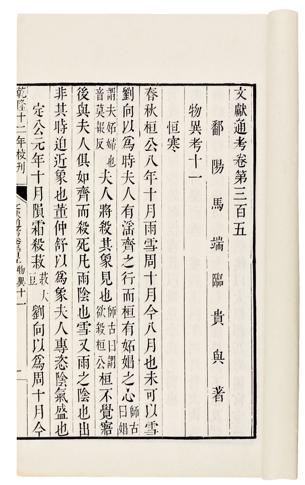 是书纸质洁白如玉,方体字上板,点划极精,初印无疑。版心上方刻有“乾隆十二年校刊”字样。拍品惜存三百至三百零五卷。