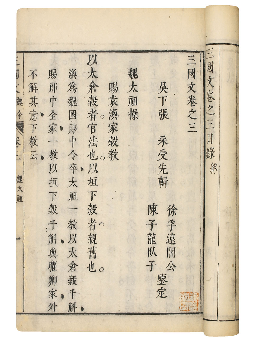 拍品刊刻精整,未加栏格,天头镌有批语。辑者张采生于万曆二十四年,因强烈不满晚明的黑暗统治,口诛笔伐,著述颇丰。张采(1596-1648),字受先,号南郭,江苏太仓人。与同里张溥齐名,号“娄东二张”。
