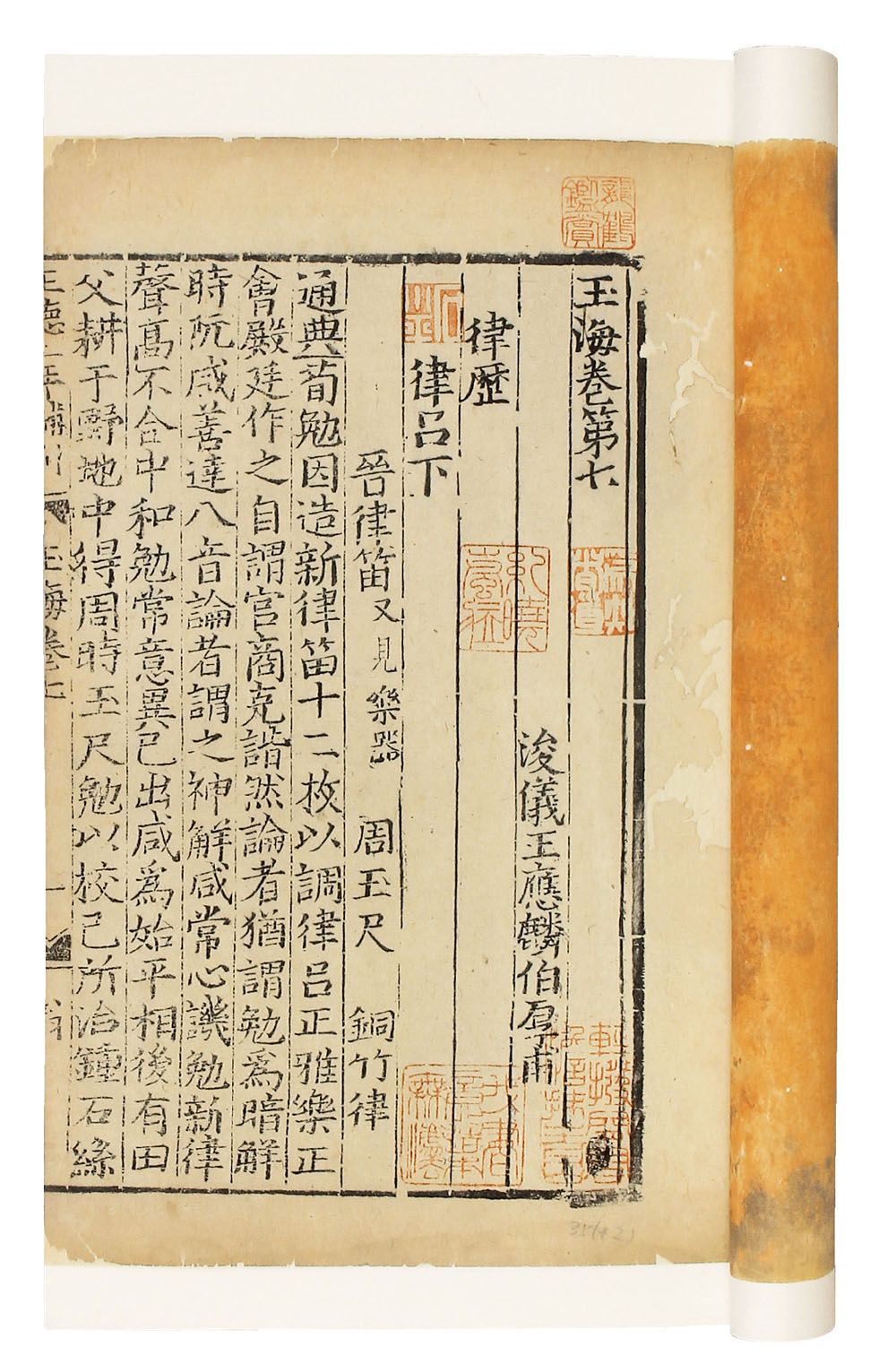 是书金镶玉装,皮纸精刊,版心上方有“正德二年补刊”、“万曆癸未年补刊”、“万曆丁亥年补刊”等字样。另有上刊数字,下刊刻工名的均为元刊。《玉海》是一部规模宏大的类书,《四库提要》有云:“其贯串奥博,唐宋诸大类书未有能过之者。”