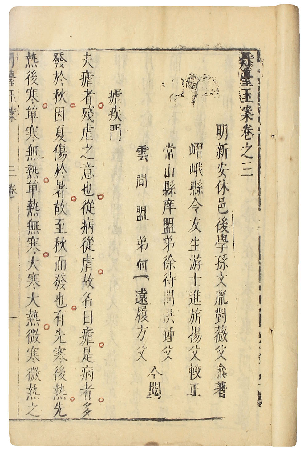 是书明版刻书风格,“玄”字不避。此书为古代著名综合性医学著作,世为医家所重。孙文胤为明末知名医生,因自幼多病,遂发愤钻研,此书为其一生医学思想之总结,内容广泛,尤其是有关养生方法的论述在中国医学史上极富盛名。