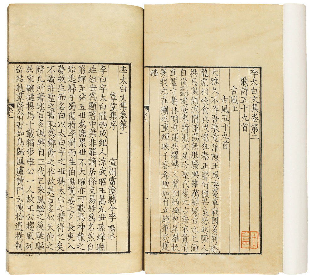 是书天头阔大,写刻精美。宋版《李太白文集》传至清已经极为罕见,康熙五十六年吴门缪日芑得昆山徐氏所藏北宋刻本,曾影刻行世,由于摹镌精湛,世称善本。拍品每卷尾镌有“吴门缪曰芑武子甫重刊宋本”一行,精妙古雅,点划清晰爽利,笔锋可辨,印刷水平上乘。
