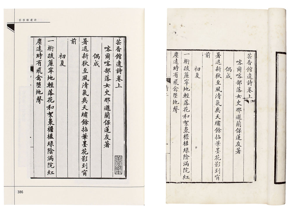 提 要: 此书为女诗人的诗集,由黄裳选录于《清代版刻一隅》,其书收录古籍颇为严格,同治一朝仅选了四种,该书为第三种。另查《中国古籍善本总目》,全国仅一家公藏有存,可见其传世稀少。清同治十二年,盛昱母亲去世,悲痛万分,便亲自整理母亲遗稿,并亲自手写上板(后自跋云:“太夫人丁巳岁手抄本,又益以搜辑,所得共九十一首,编为二卷,录付梓人”)刊刻,以托哀思,遂成此本。并请学者李慈铭撰写序言,且其序言也是据手稿直接上板,使得全书自头至尾皆用行书刊就,笔划舒展,镌刻甚精,确如黄裳所云“写刻甚精,于晚清雕版中不多见”。此版本中的一部曾在保利2011年6月拍卖会中以46000元成交。