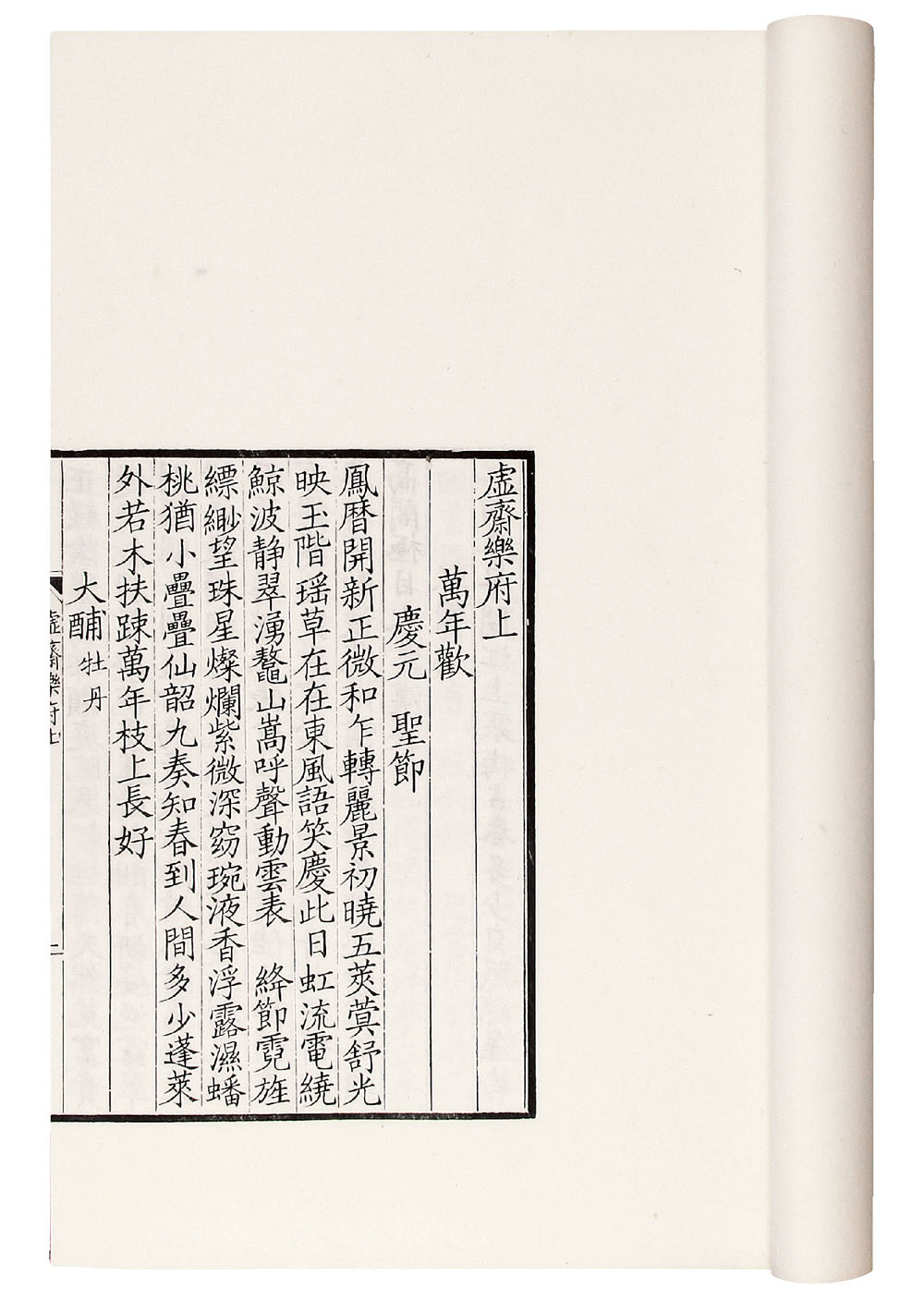 提 要: 是书为白纸印本,开本极为宽大,墨色浓郁,极初印,品相极佳。此书以毛氏汲古阁影宋抄本为底本影刻,书前有黄丕烈、顾广圻跋,言该书抄写始末,此抄本现藏于国家图书馆。书末将南宋陈解元刊刻条记“临安府棚前北睦亲坊南陈解元书籍铺刊行”一并刻出,还原了该书宋版原貌。赵以夫,字用父,号虚斋,南宋长乐人,雅好诗词,其词集以号为名,称为《虚斋乐府》。