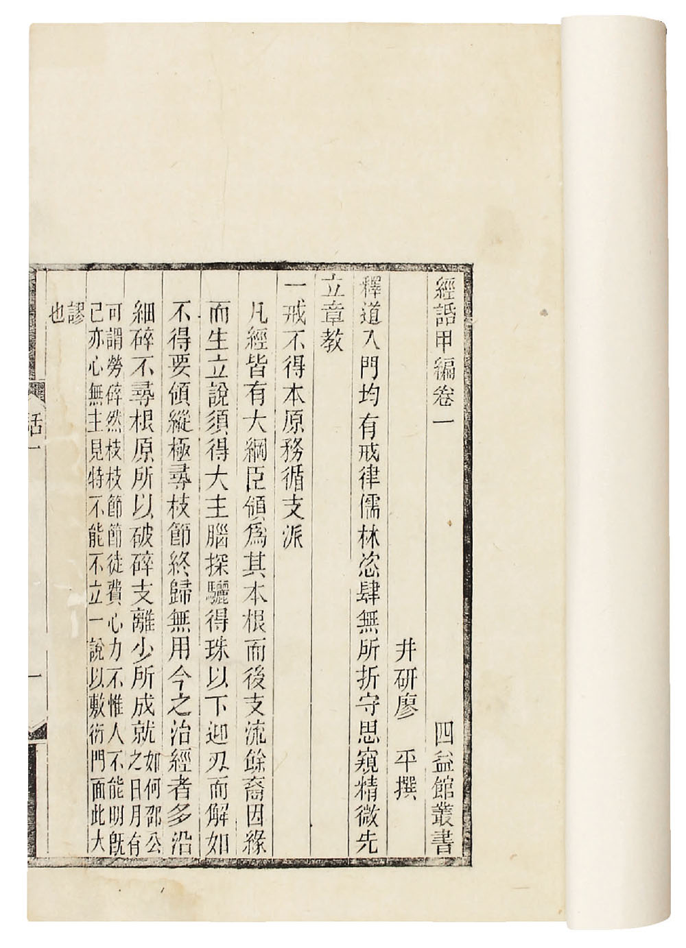 拍品为《新订六译馆丛书》零种,甲编第一卷。廖平,字季平,初名登廷,字旭陔。初号四益,继号五译,晚号六译。廖平一生勤于著述,成果斐然,有著作140余种,先后编为《四益馆丛书》、《六译馆丛书》。内容涉及经史、 小学、医药等领域。是中国近代最大的经学大师。