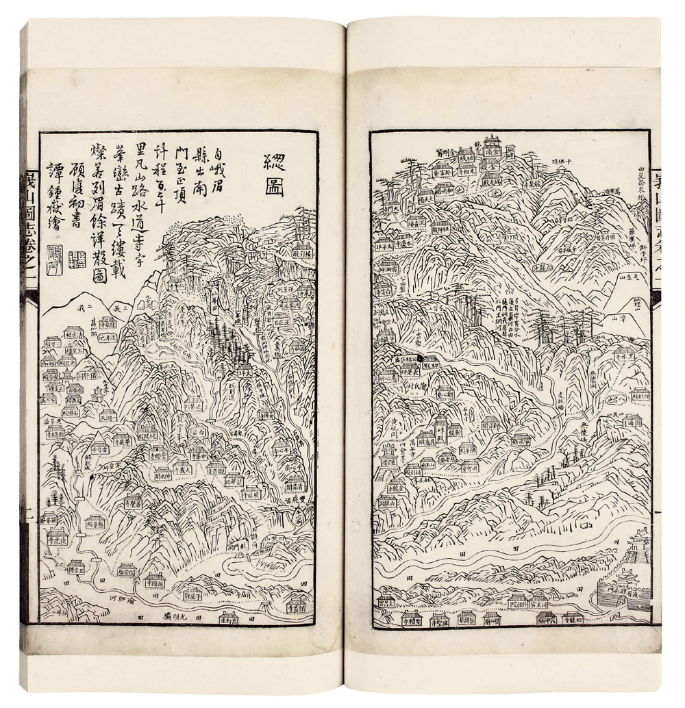 提 要: 是书白纸精刊,收图六十四幅,全山总图一幅,上山和下山图53幅,峨山十景图十幅,每图皆有说,其他所叙亦详。此书采用中国传统技法绘成,刻工精湛,为古代木刻上乘之作。书中散图如连环画一般,前后衔接,将游程步数、山形道路,寺宇景点等等做了形象具体的记载和描绘。1885年因四川总督丁宝桢奏准对峨眉山的“春秋至祭”,次年黄绶芙提议重修《峨眉山志》,委谭钟岳测绘山图,廖星堂重修文字。书中所要提到的宫观寺庙现存已不多,故此书对研究历史上峨眉山寺庙的兴废提供了第一手资料。拍品品相甚佳。