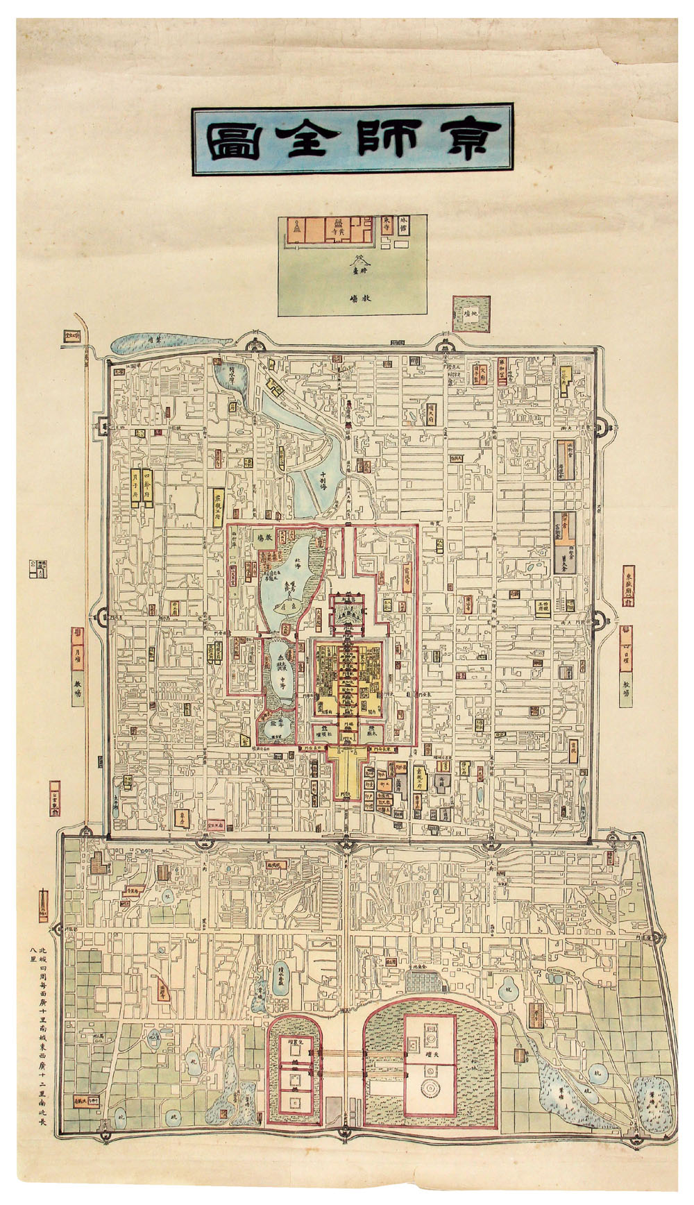 此地图中尚存顺天府等清末建筑名称,而且印制精良,彩色印刷,图中对京城的主要行政单位及寺庙、景点做了标识,似乎是当时的旅游地图。