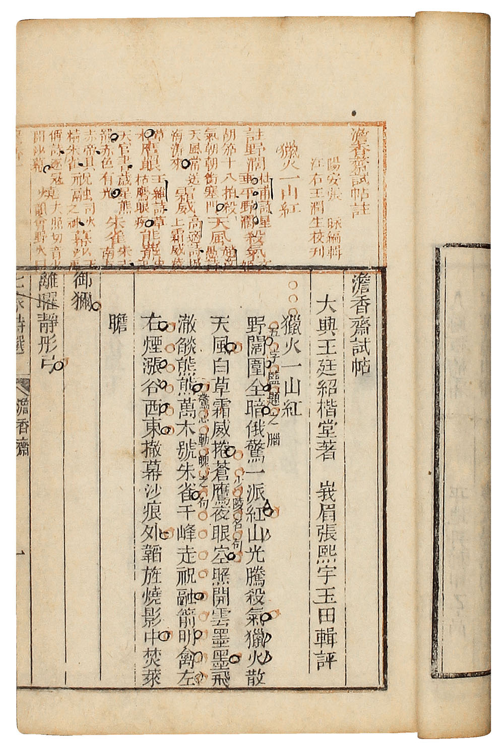 是书竹纸印本,开本小巧,笺注用朱墨刊印,间有朱墨二色批注及补抄。是书收录澹香斋、修竹斋、柽花馆等试贴七卷,诗歌四百余首,作为家塾课本。