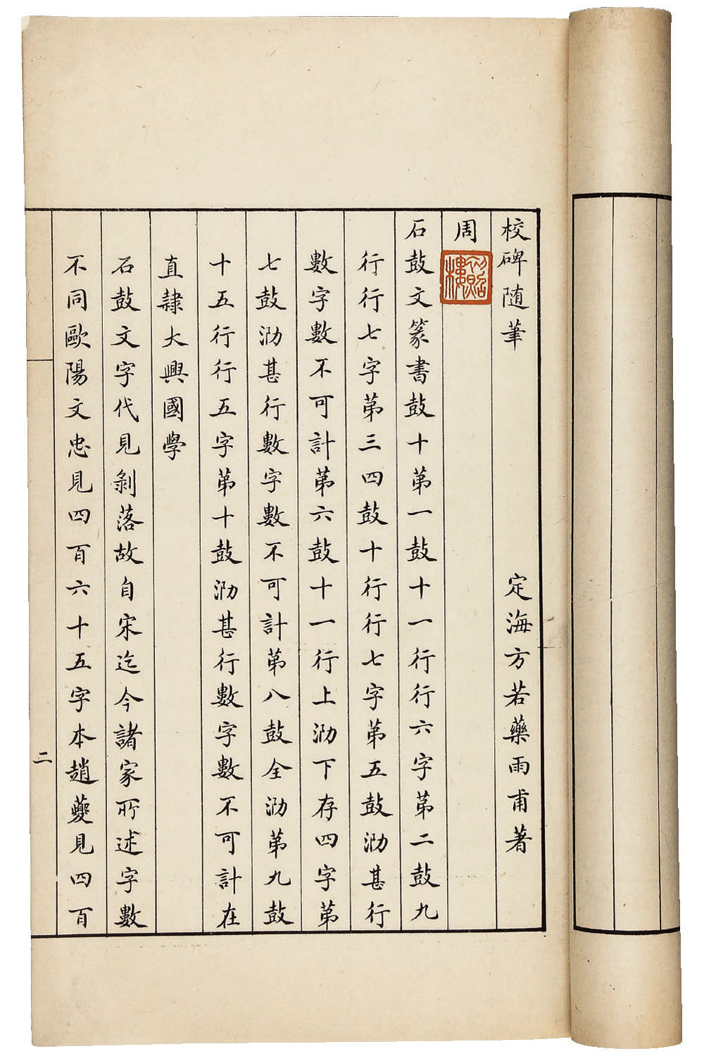 是书版面清爽,书末有“天津中东石印局石印”字样。该书为晚晴碑帖大家方若撰,专校周秦石鼓文至五代间五百余片碑碣之文字内容,对碑石涣泐等详加记叙,为清末以来校碑之集大成之作,为后人鉴定碑帖提供了宝贵的参考,已成金石研究者必备工具书。