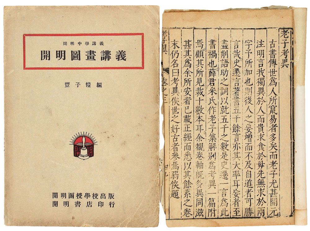 拍品包括:明刻本《老子考异》存卷三、《左传》存卷六、《资治新书》存卷八;民国二十二年排印本《清宣统朝外交史料》存卷四;民国二十三年开明函授学校出版的开明中学讲义《开明图画讲义》,丰子恺编;光绪二年石印本《增注字类标韵》六卷;民国间石印本《增评绘图石头记》。