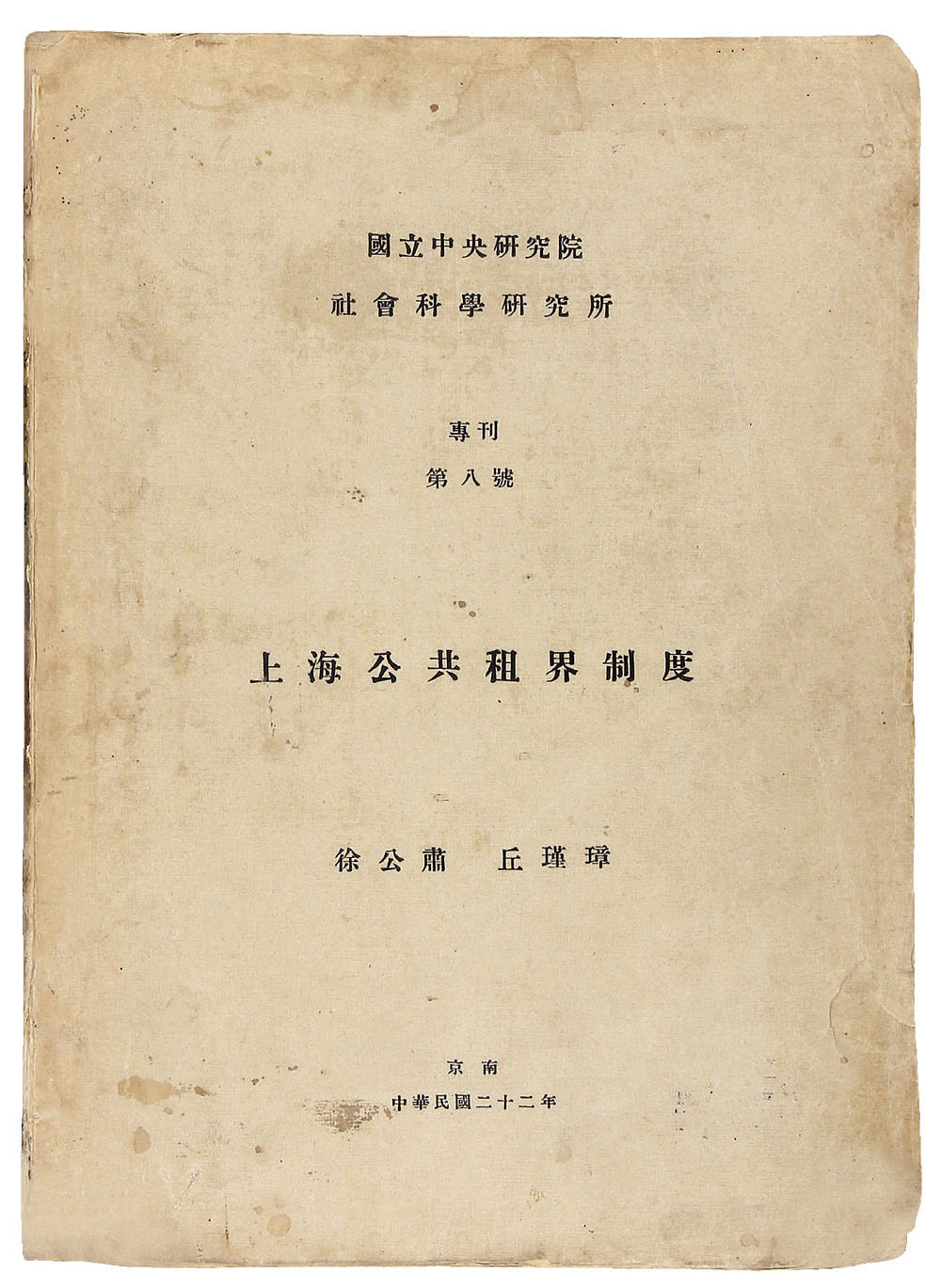 拍品为国立中央研究院社会科学研究所专刊第八号,徐公肃、邱瑾璋撰,从历史的发展、制度的解剖与观察、法理的考察三方面进行研究。