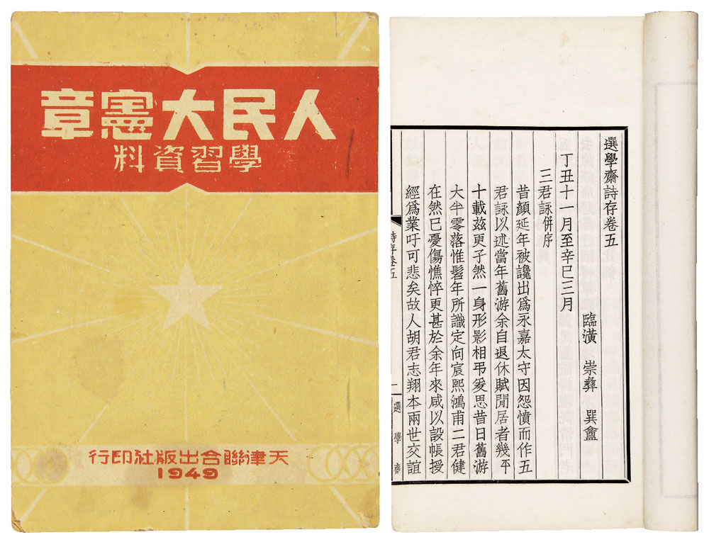 拍品包括:1949年华北新华书店出版《党的建设问题》;1949年联合出版社出版出版《人民大宪章学习资料》;民国十三年(1924)上海文明书局出版《黄山谷千峰诗》;旧印本《古今名人墨迹大观》;旧刻本《选学斋诗存》卷五等六种。