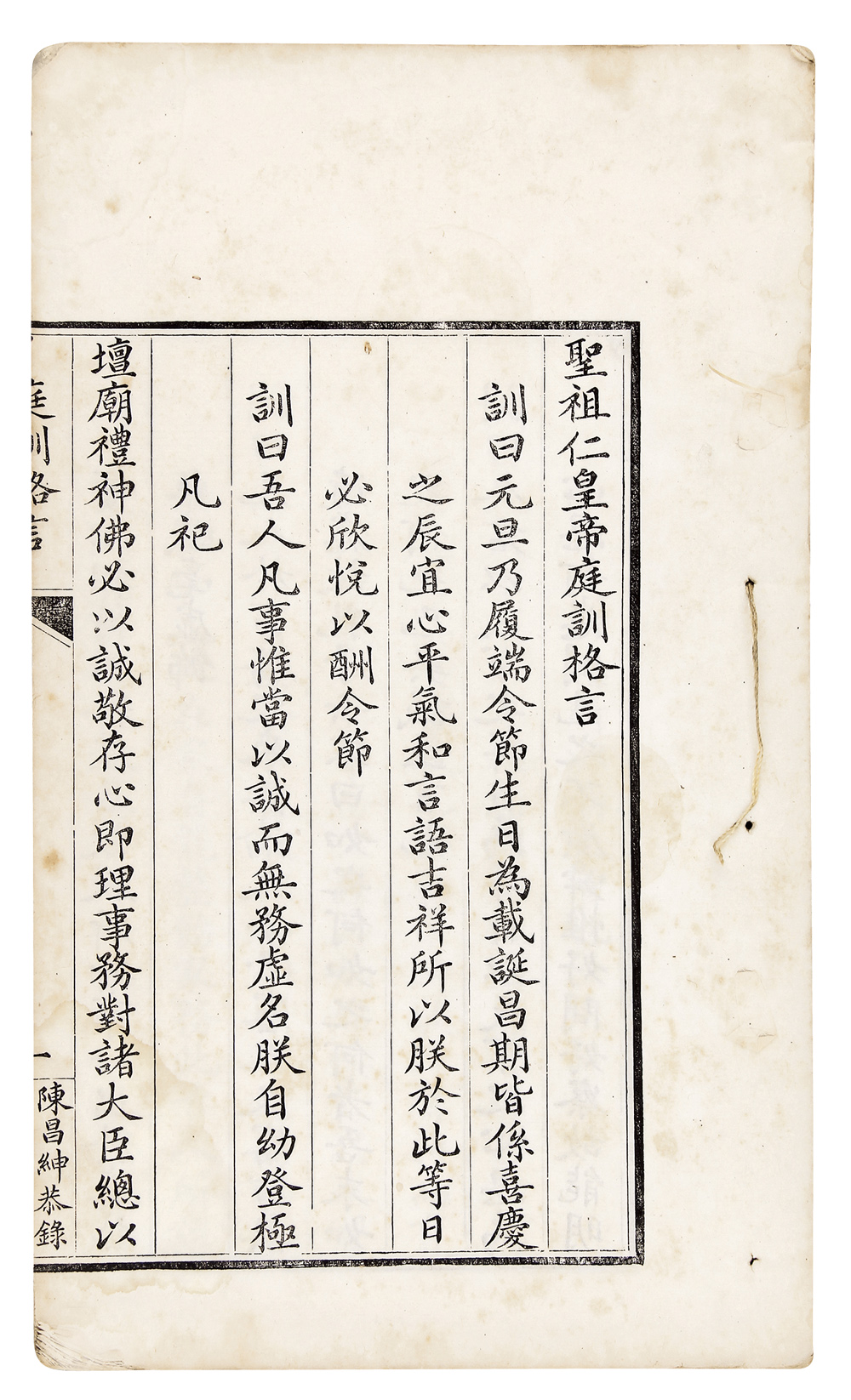 提 要: 是书开本阔大,版面清爽,版刻整饬,通篇写刻上板,字体疏朗悦目,尾镌“江苏书局恭刻”,版心下端镌“陈昌绅/邹福保/赵以焕/章钰恭录”字样,计十一人,皆清季官宦学人。恭录恭刻,刊印精美。 该书为雍正皇帝继位后与其兄弟追记其父皇康熙皇帝庭训之诰的集结,凡二百六十余则,内容十分广泛,上至治国之道,下至起居之法,皆有涉及,对于了解康熙皇帝本人的思想及其对皇室子弟的教育方法极有参考价值。
