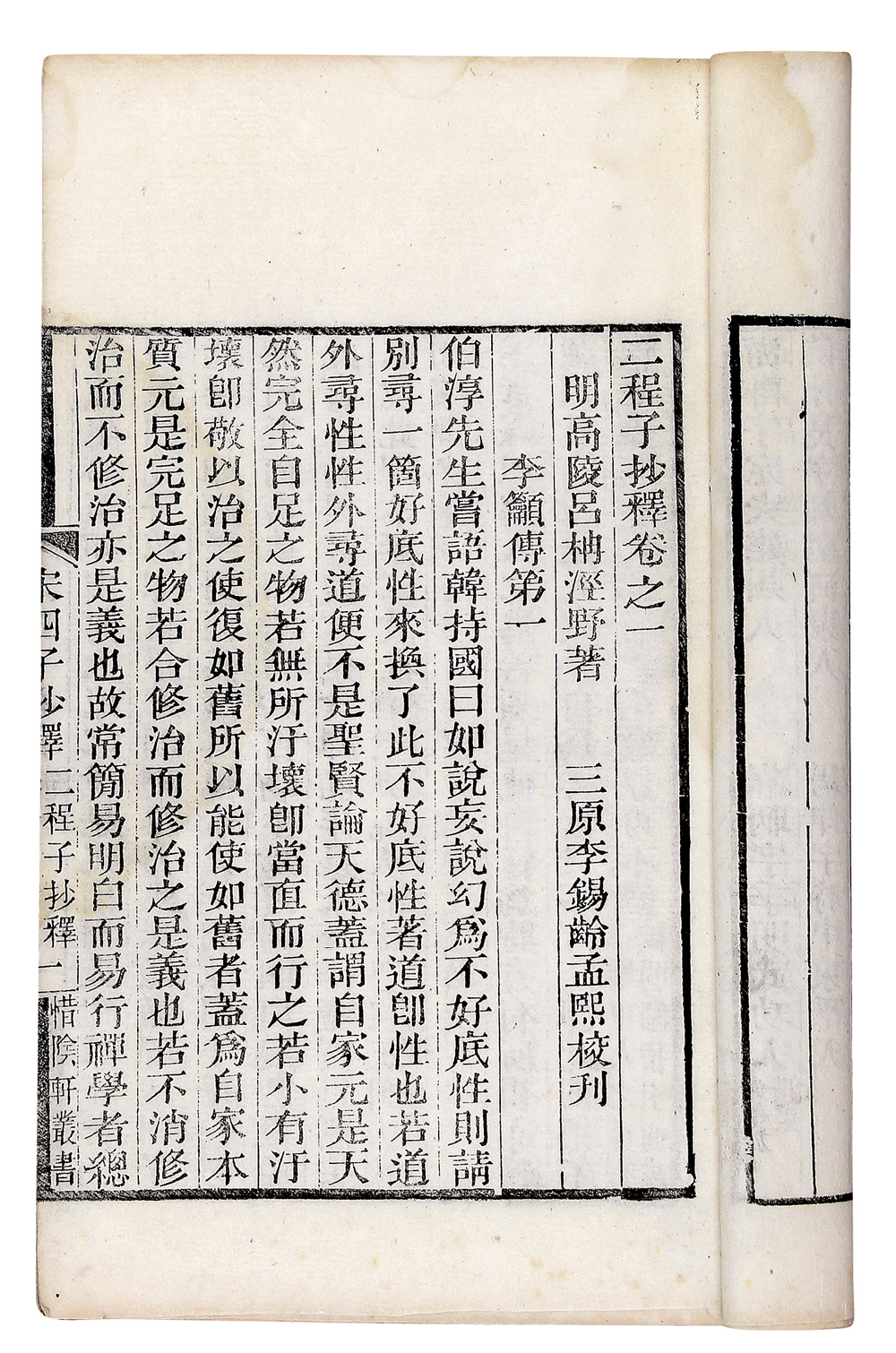 是书老装未衬,字形方整,内有插图多幅。此为宋代朱熹、张载等五位理学家的文章选编,包括《周子抄释》三卷、《二程子抄释》十卷、《张子抄释》六卷、《朱子抄释》二卷,为考订宋明理学的发展提供了颇为详实的材料。