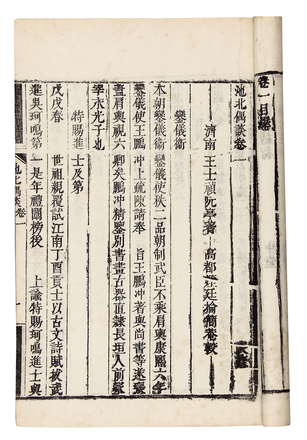 提 要: 是书老装老函,仿宋体字刊印,四周单边,大黑口。此书又名《石帆亭纪谈》,为清代著名笔记小说,部分内容由作者儿辈整理而成,分为谈故、谈献、谈异、谈艺四目,而前三目最具参考价值。 王士祯(1634-1711),字子真,号阮亭,自号渔阳山人。曾任礼部、户部主事、郎中、翰林院学士,刑部尚书等职,一生著述颇丰。