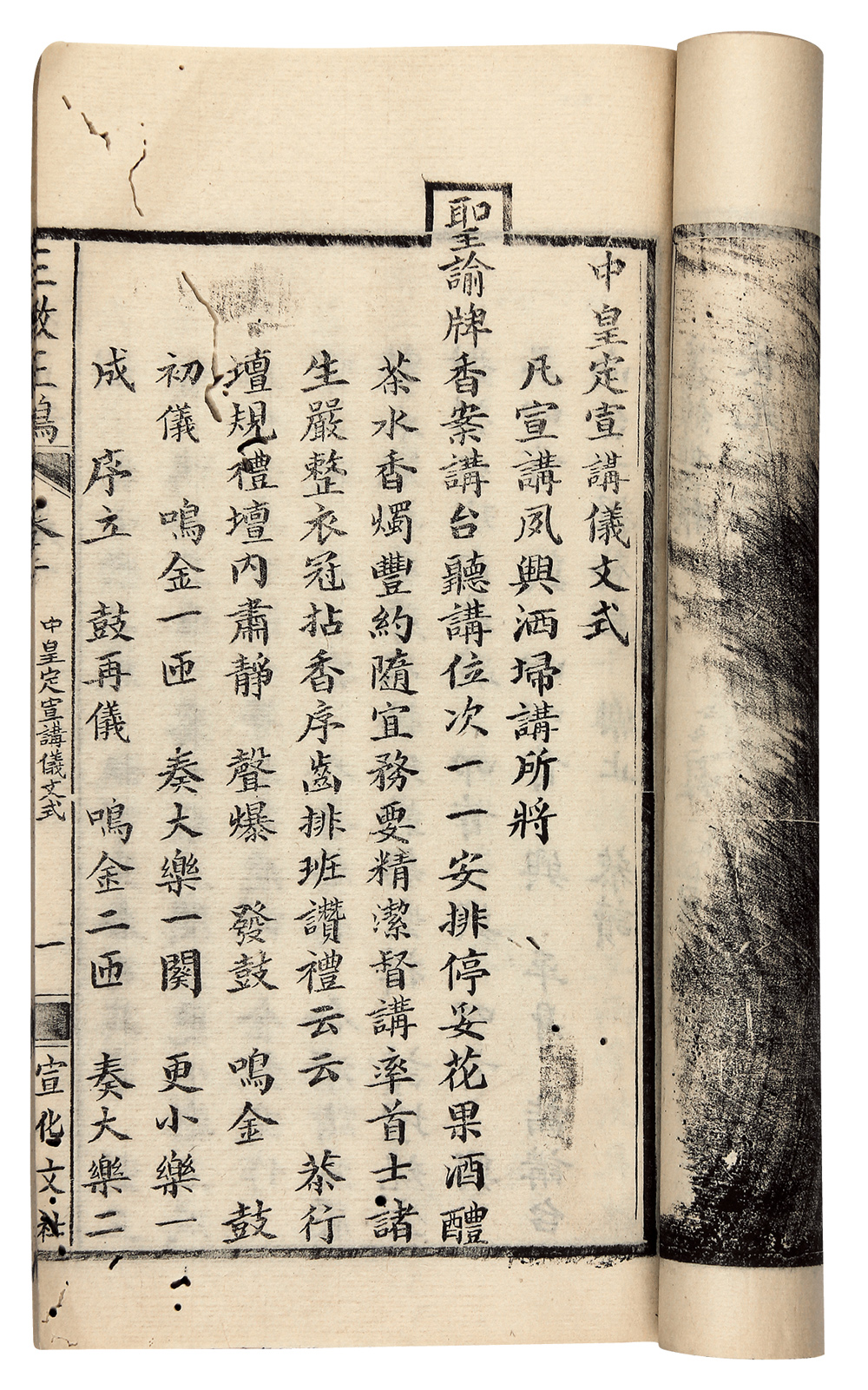 是书老装未衬,全书文字皆手写上板,版心下方镌“宣化文社”字样,牌记页、卷首序皆朱印。牌记页题“光绪三十年甲辰仲秌月中湘十一总三皇宫藏版”。此为劝善类书,宣扬善恶报应、因果等。