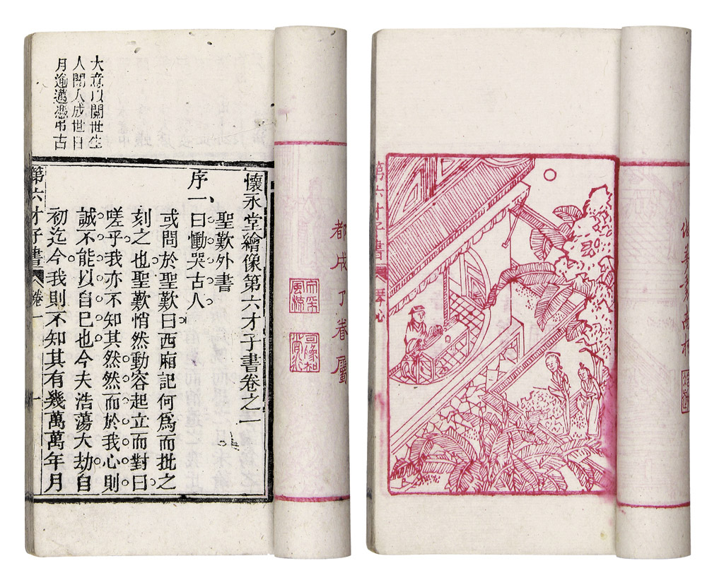 是书为白纸印本,开本小,卷前有红印版画,绘制精美。《西厢记》自元代形成定本以来,流传极广,版本甚多,其中尤以金圣叹本流传最广,影响最大,“第六才子书”也正因其得名。