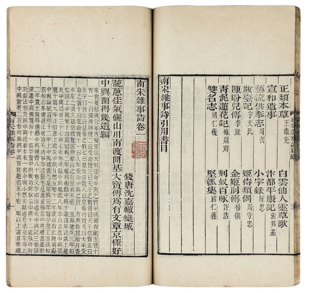 是书老装未衬,竹纸印製,天头开阔,字形方整,文间间或有硃笔圈点。该书是一部咏史诗专集,七卷,清沈嘉辙、吴焯、陈芝光、符曾、赵昱、厉鹗、赵信七人同撰,用诗加小注的形式展示南宋一百余年间杭州风貌,是一部很有价值的南宋史实类书。