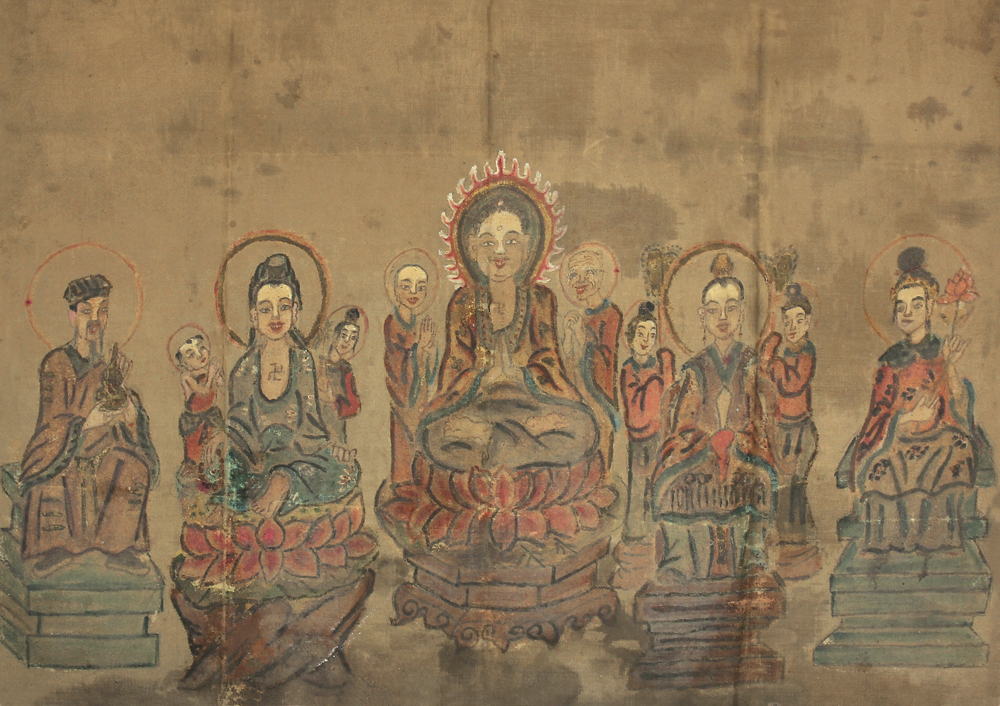 拍品包括《佛说摩诃般若波罗蜜多心经》一幅,用泥金写于瓷青色绢之上,老纸托裱。另有佛像画像一幅。