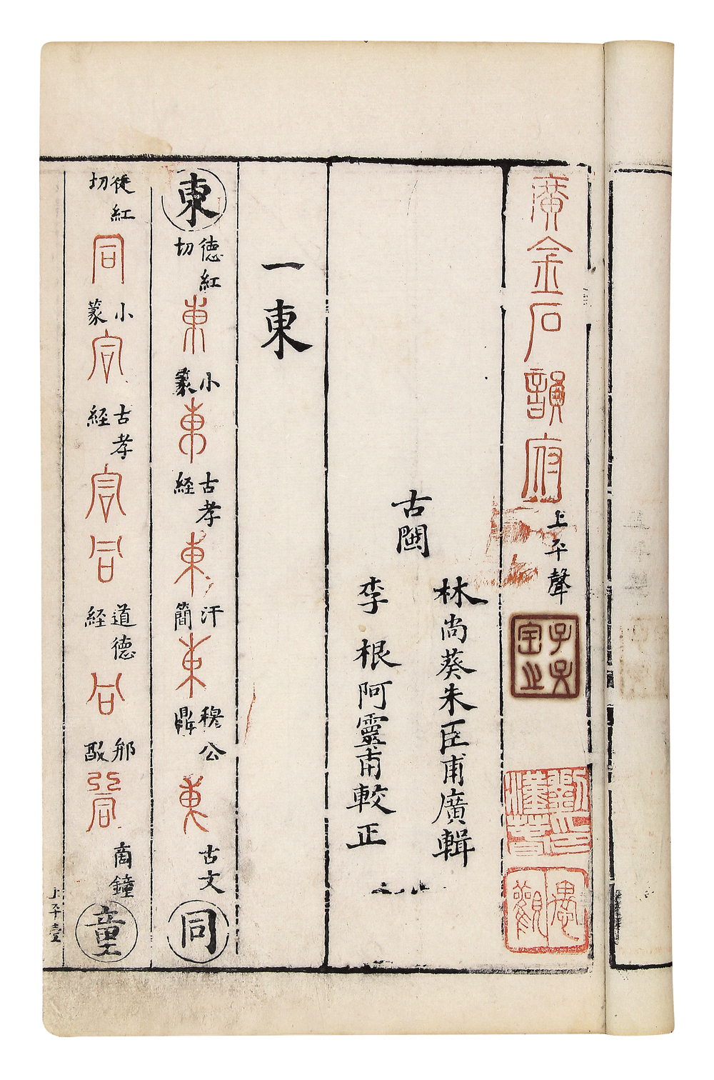 提 要: 是书为白纸精印本,文字全部为手写上板,尤其书前的周亮工隶书长篇序言,镌刻甚精,字口清晰自然,当为初印,其品相亦属上乘。该书体例是以韵目为检索途径,每个字条首列用黑墨印的楷书字,后列历史上出现过的各体篆字,其皆改以硃墨印刷,翻阅之下,硃墨相间,楷篆判然,极便翻检。最关键的是林氏将所收篆字的来源出处一并标明,颇便考索,这也是其补注朱云《金石韵府》过程中最大的一项贡献,对于研究历史上篆字形体的延变有重要意义。著录:《中国古籍善本总目》P174