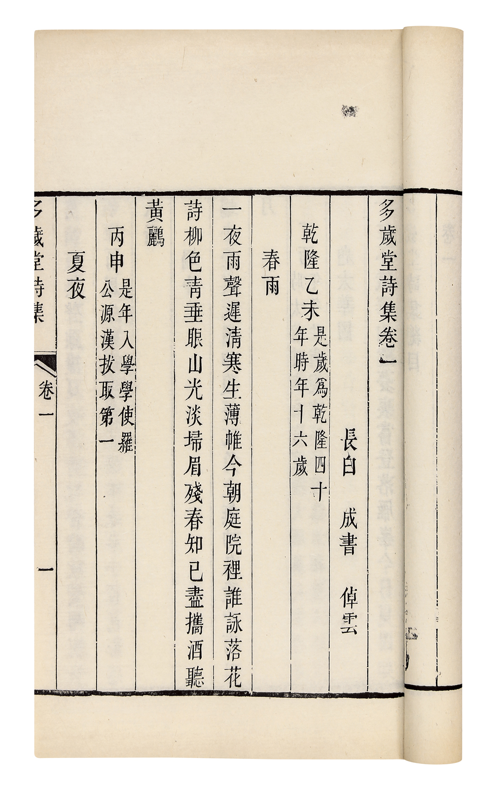 提 要: 是书原装原签,刻印精雅,版面爽利,原签尚存,品相佳。《多岁堂诗集》收有成书历年诗作,《多岁堂古诗存》为成书所编选的古诗。成书(1760-1821),字倬云,号误庵,穆尔察氏,满洲镶白旗人,乾隆四十九年进士,嘉庆三年为内阁学士,道光间为户部、兵部右侍郎。